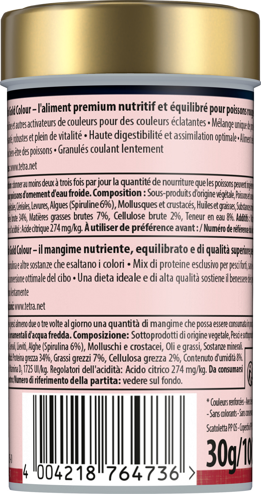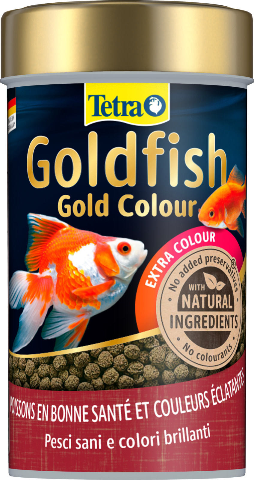 Les granulés Tetra Goldfish Gold Colour sont des aliments nutritifs et équilibrés de qualité supérieure pour poissons rouges. Une alimentation idéale et de haute qualité contribue à la santé et au bien-être des poissons. L’aliment contient des caroténoïdes provenant d’algues spirulines, véritables activateurs de couleurs pour une coloration éclatante des poissons. Les granulés coulant lentement offrent une haute digestibilité et une assimilation optimale des aliments, permettant de réduire les déchets et la pollution de l’eau. La recette unique, composée d’ingrédients naturels de haute qualité, sans colorants ni conservateurs ajoutés, et le mélange de protéines parfaitement adapté favorisent une croissance optimale, une vitalité et une résistance accrues. Grâce aux granulés Tetra Goldfish Gold Colour, vos poissons rouges se porteront à merveille et l’eau de votre aquarium restera saine et claire.