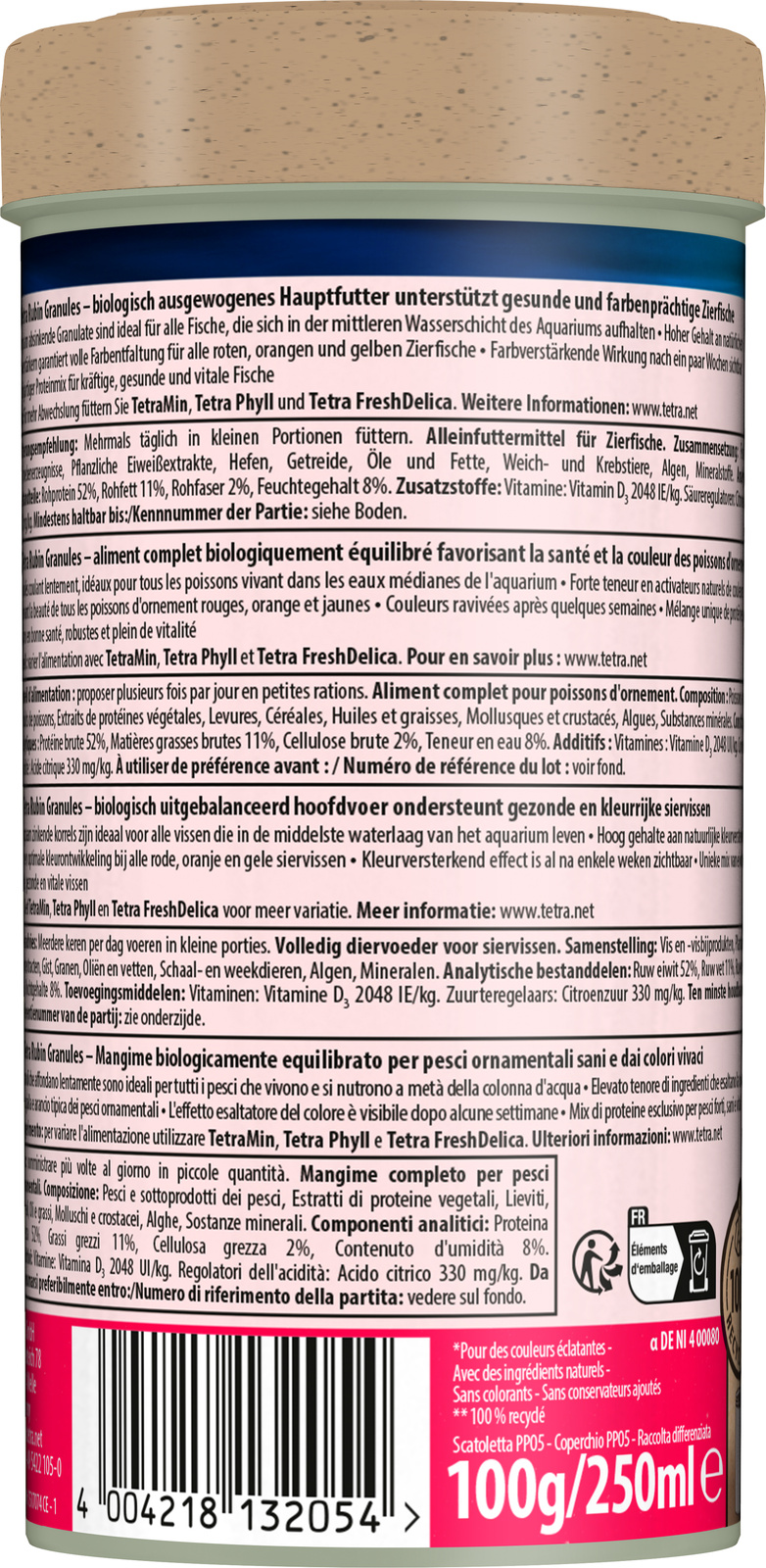 Tetra Rubin Granules est un aliment complet biologiquement équilibré pour l’alimentation quotidienne de tous les poissons d’ornement. L’ajout d’ingrédients naturels activateurs de couleurs permet de sublimer l’éclat des couleurs naturelles des poissons rouges, orange et jaunes. Les couleurs sont visiblement ravivées après plusieurs semaines d’utilisation régulière. En raison de leur forme spéciale, les granulés coulent lentement, ce qui les rend parfaits pour les poissons se nourrissant à mi-profondeur. Cette recette exclusive, composée d’ingrédients naturels de qualité supérieure, sans colorants ni conservateurs ajoutés, et d’un mélange de protéines parfaitement adapté, favorise une croissance et une vitalité optimales, ainsi qu’une meilleure résistance. Avec Tetra Rubin Granules, vos poissons d’ornement s’épanouiront et l’eau de votre aquarium restera propre et claire.